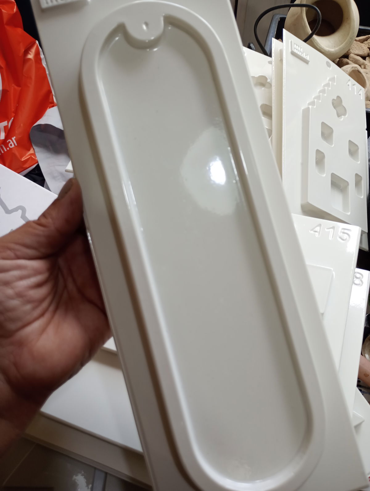 Molde termoformado modelo 409, liviano y flexible, con diseño liso y alargado ideal para porta sahumerios. Compatible con cemento blanco, resina acrílica, yeso o pasta piedra. De forma simple, versátil y con buena definición, es perfecto para proyectos personalizados, decorativos o funcionales.