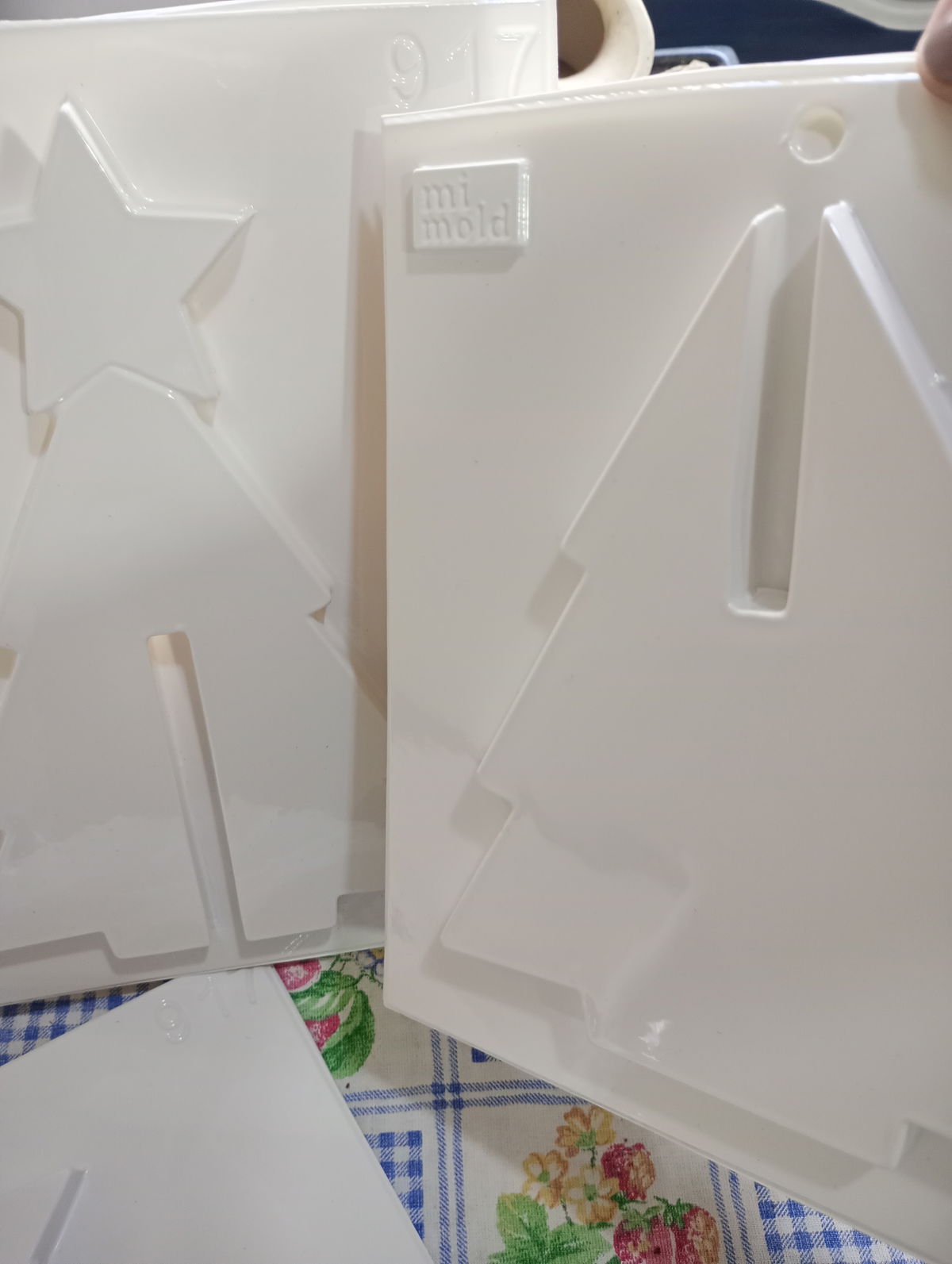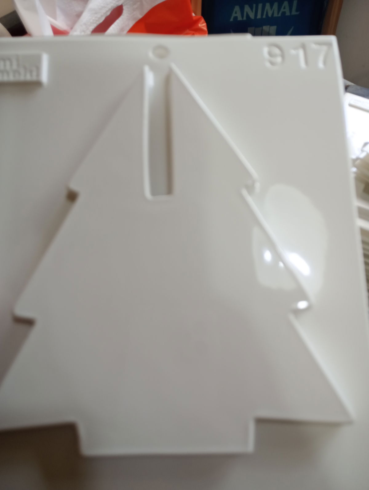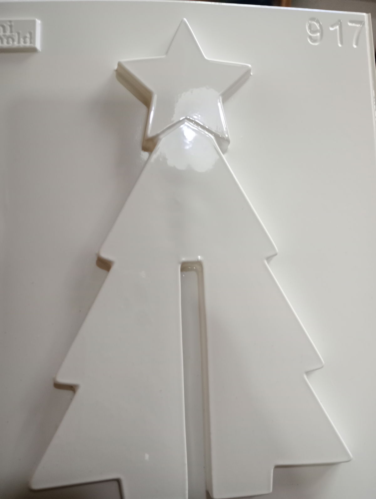 Molde termoformado modelo 917, liviano y flexible, compuesto por dos piezas que encastran para formar un árbol de Navidad tridimensional. Ideal para creaciones decorativas navideñas en cemento blanco, resina acrílica, pasta piedra o yeso. Fácil de desmoldar, buena definición y excelente opción para decorar hogares, eventos o regalar en fiestas.