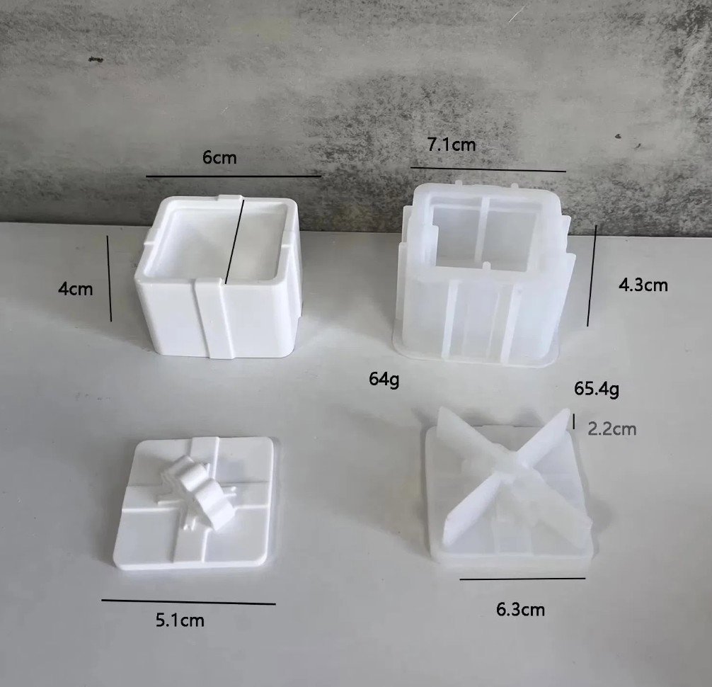 Molde de silicona en forma de contenedor caramelera cuadrado con tapa ideal para crear macetas originales y decorativas en cemento, yeso o resina acrílica. Su diseño aporta una estética delicada, perfecta para proyectos artesanales con identidad propia.