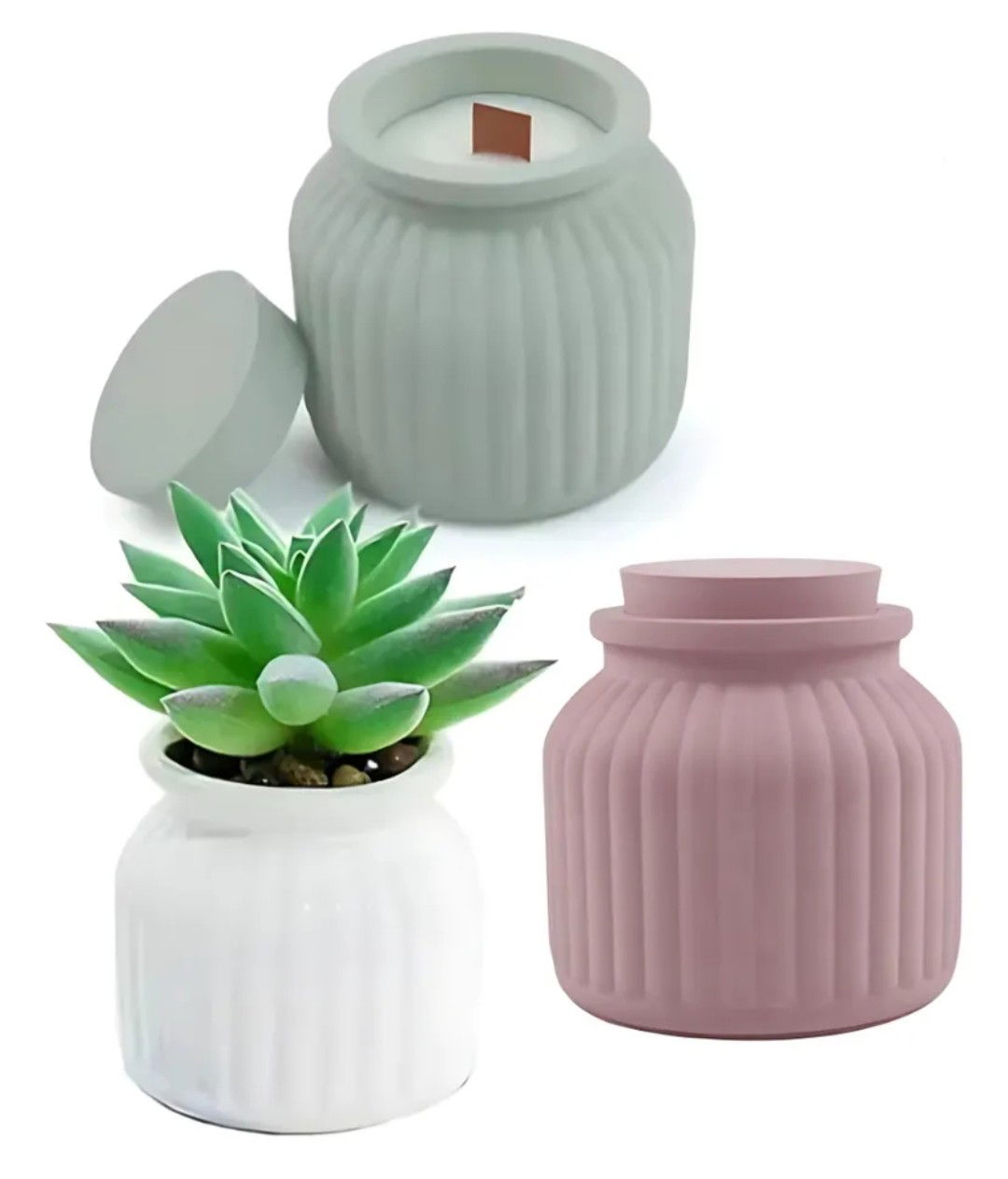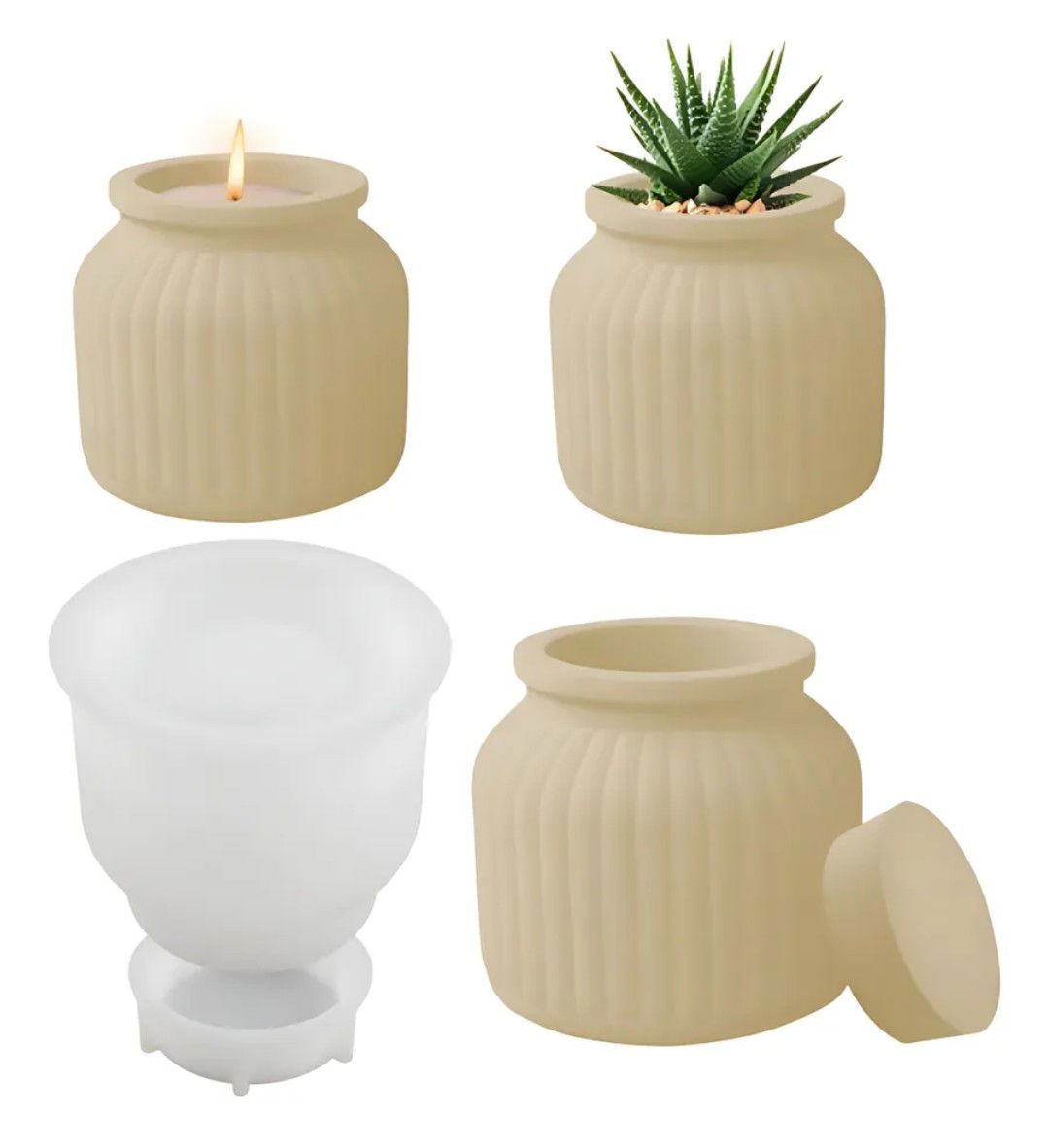 Molde de silicona en forma de contenedor con tapa ideal para crear macetas originales y decorativas en cemento, yeso o resina acrílica. Su diseño aporta una estética delicada, perfecta para proyectos artesanales con identidad propia.