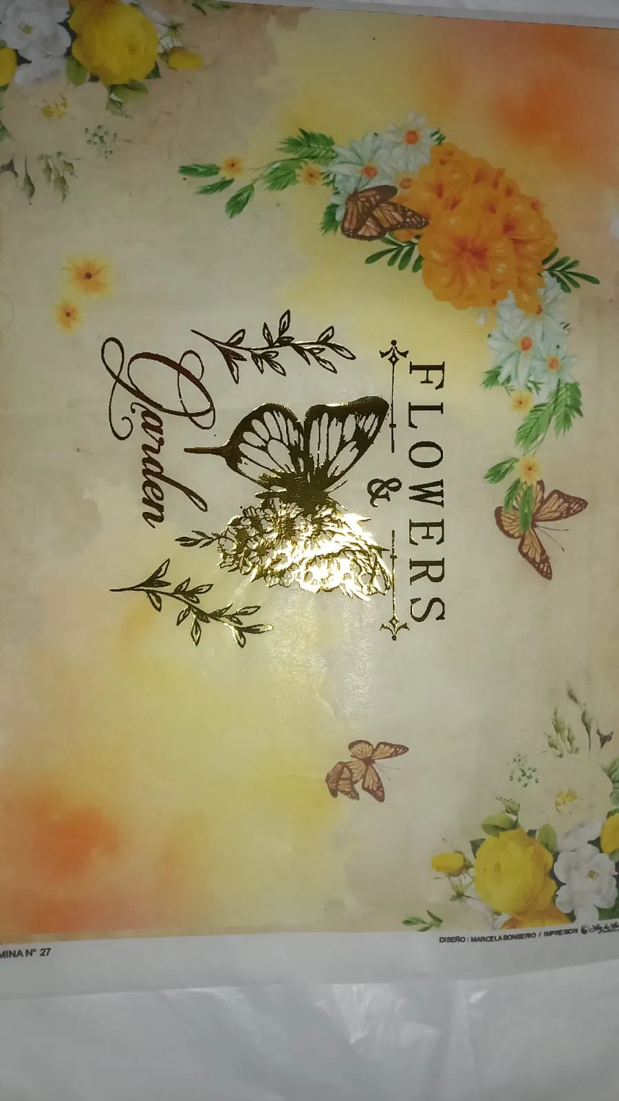Lámina decorativa en papel tipo seda opaca, tamaño A4 (21 × 29,7 cm), con detalles metalizados en dorado. Diseñada especialmente para decoupage en piezas de cemento, madera, cartón o vidrio. Aporta un acabado sobrio con puntos de brillo delicado.