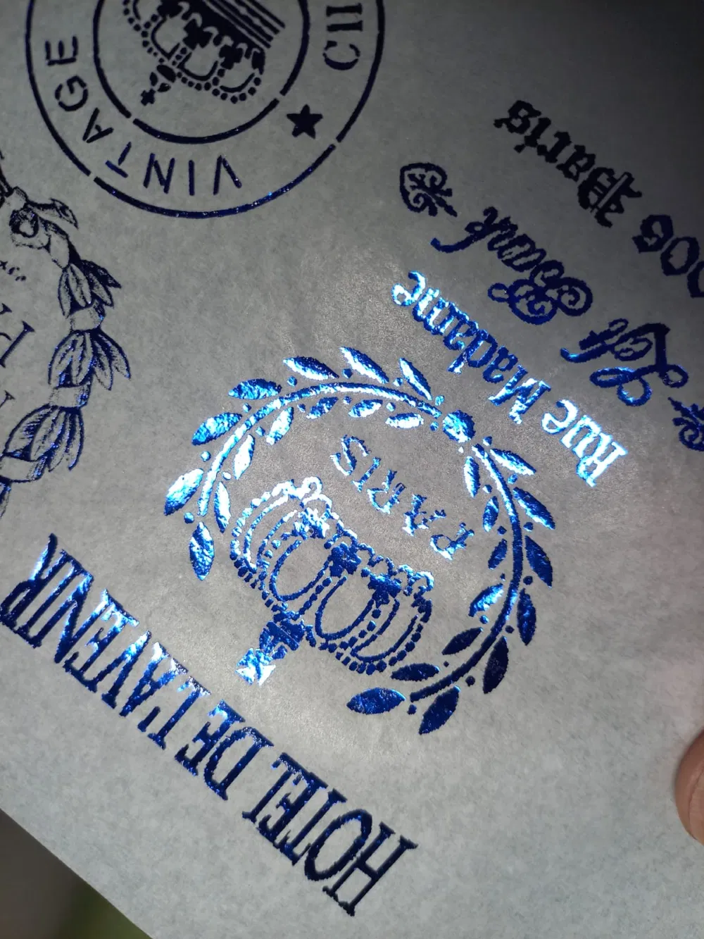 Lámina decorativa tamaño A5 (21 × 14,8 cm) en color azul metálico. Hecha en papel tipo seda, es ideal para decoupage sobre cemento, madera, cartón o vidrio, aportando un acabado llamativo y artesanal.