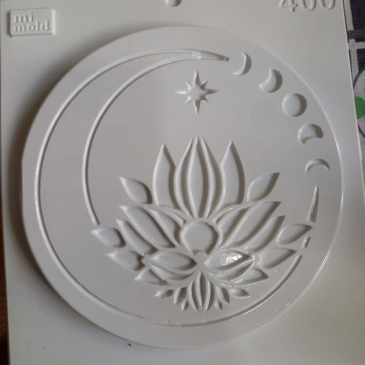 El molde termoformado liviano número 400 presenta un diseño simbólico con flor de loto, luna creciente y una pequeña estrella, ideal para piezas de cemento, yeso y resina acrílica.