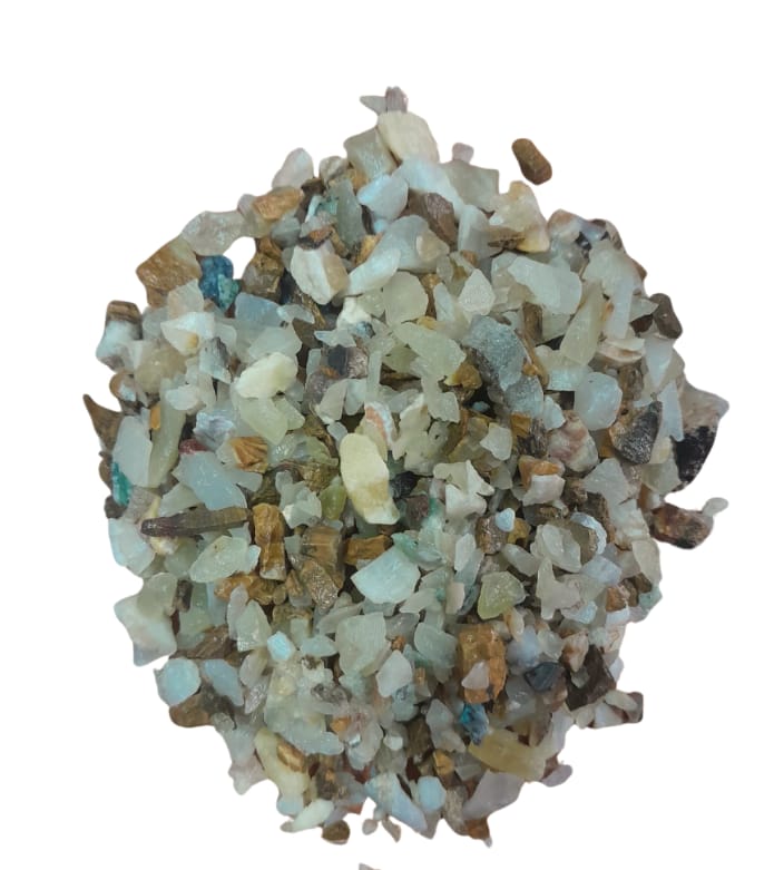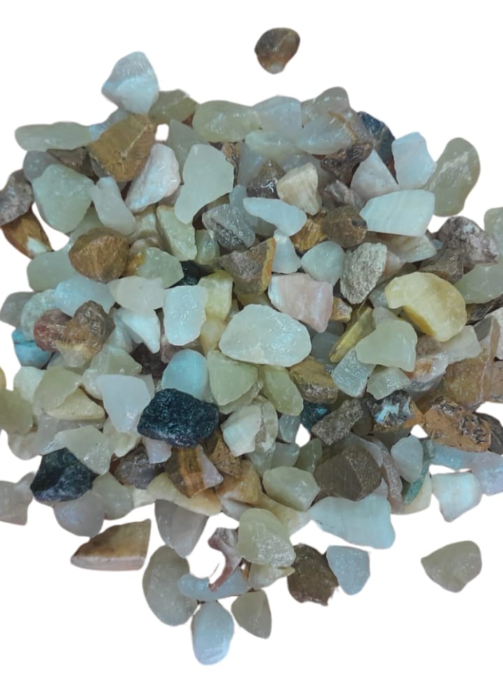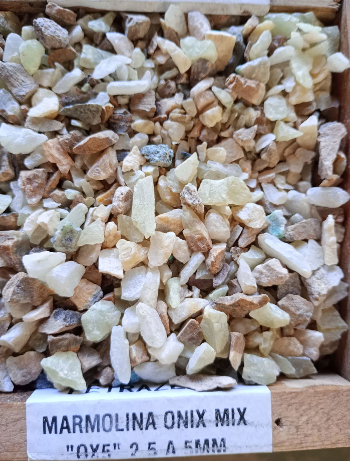 Piedra marmolina Onix Mix, ideal para terrazzo artístico, pastinas decorativas y objetos en cemento, resina o yeso. Su mezcla de tonos blancos, grises y negros genera contraste y profundidad visual en cualquier pieza.