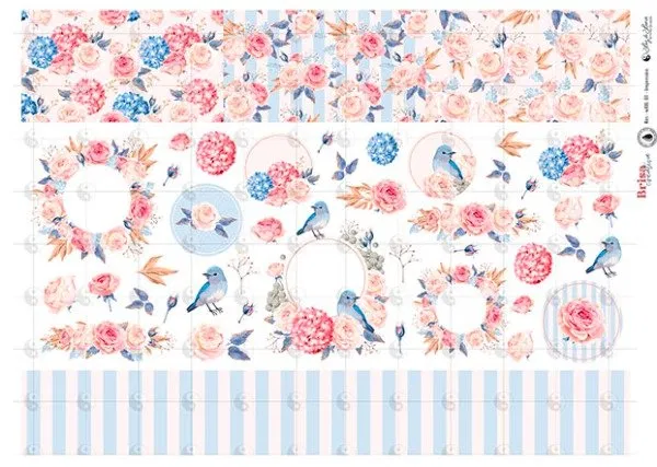 Lámina decorativa en papel tipo seda, tamaño 50×70 cm, marca Luz de Luna, colección Rosas. Ideal para trabajos de decoupage sobre cemento, madera, cartón, vidrio o tela. Diseño: by Brisa Creativa.