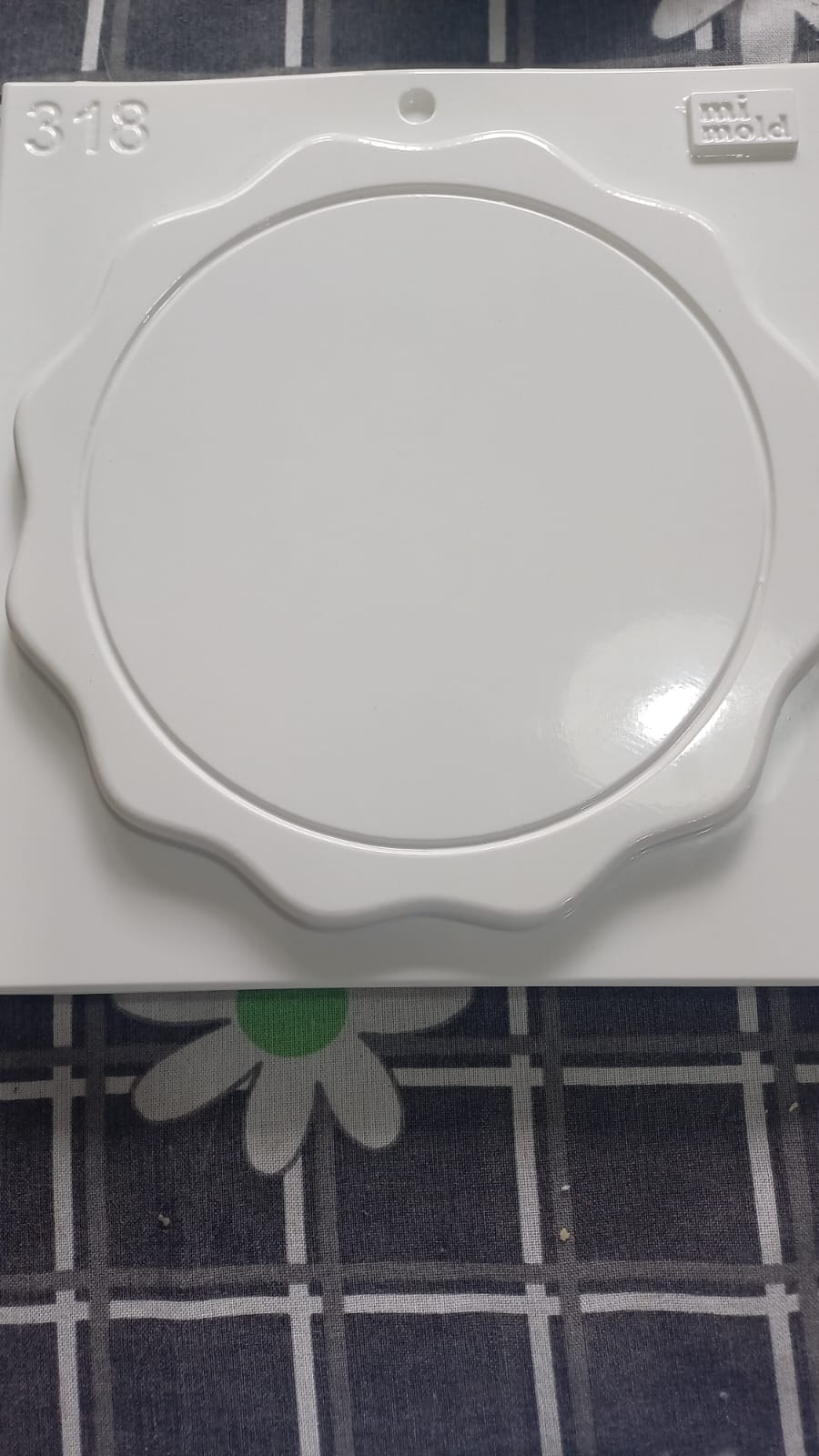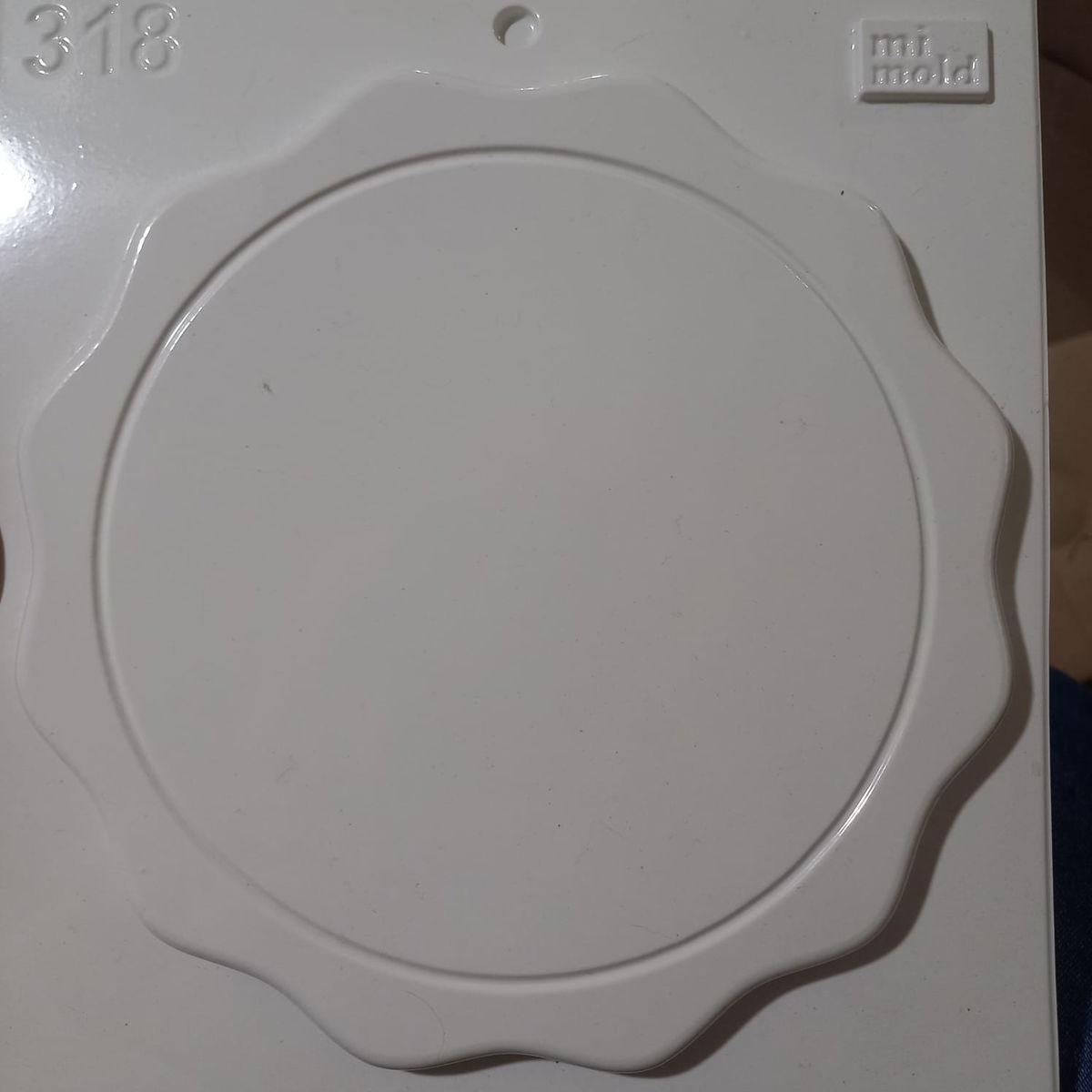 El molde termoformado liviano número 318 tiene forma redonda con un delicado borde ondulado. Su diseño limpio y versátil permite crear bandejas decorativas, bases para velas o platos funcionales con cemento, yeso o resina acrílica.