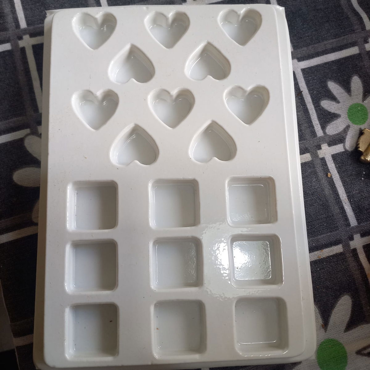 El molde termoformado liviano número 194 incluye 12 venecitas cuadradas y 8 con forma de corazón, de aprox. 2,5 x 2,5 cm cada una. Es ideal para realizar detalles decorativos, imanes, souvenirs, mosaicos o accesorios pequeños en cemento, yeso o resina acrílica.