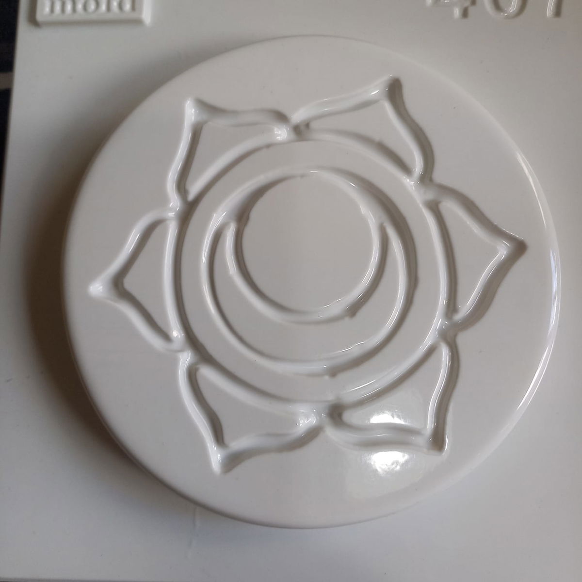 El molde termoformado liviano número 407, con diseño del chakra sacro (Svadhisthana), es ideal para crear posavasos decorativos, placas energéticas o tapas de fogonero en cemento, yeso o resina acrílica.